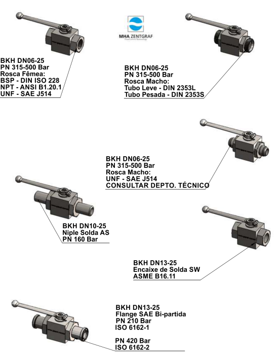 para pressões até 800 bar, temperaturas até 500°C e diâmetros nominais até 200 mm em variadas opções (roscas, tubos, flanges, duas ou múltiplas vias, etc...)